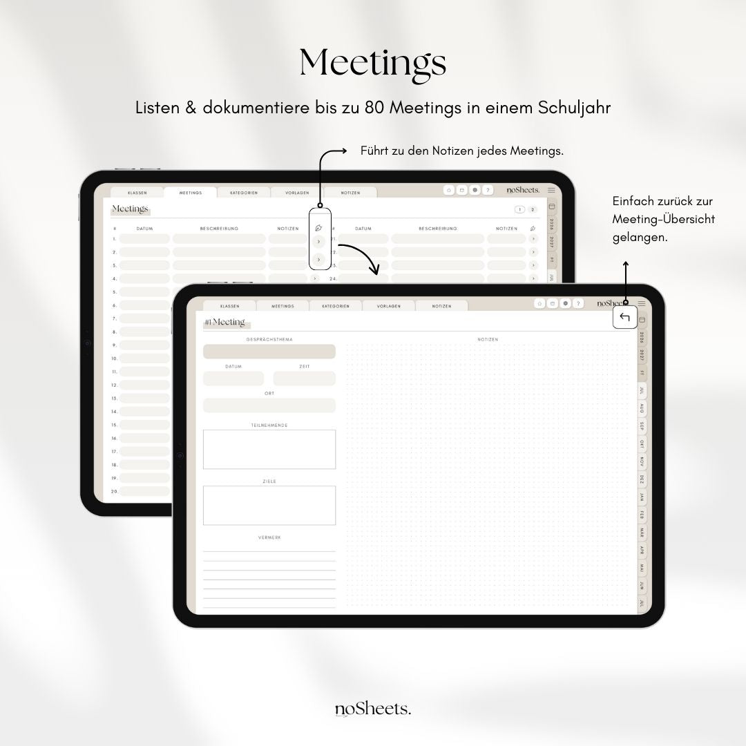 Der Schuljahresplaner für alle, die ihren Alltag gerne digital organisieren: Mit dem NoSheets Lehrerkalender 2026/27 behältst du Unterricht, Termine, Noten und Aufgaben mühelos im Blick – auf Tablet oder Laptop.